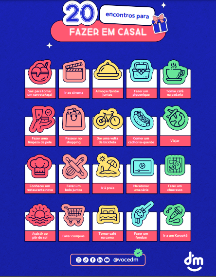 Nós compartilhamos em nossas redes sociais uma arte muito legal com 20 tipos diferentes de programas para se fazer a dois. Você pode ir riscando da lista cada desafio que for cumprido e até compartilhar nas redes sociais. Clique aqui e baixe a tabela.